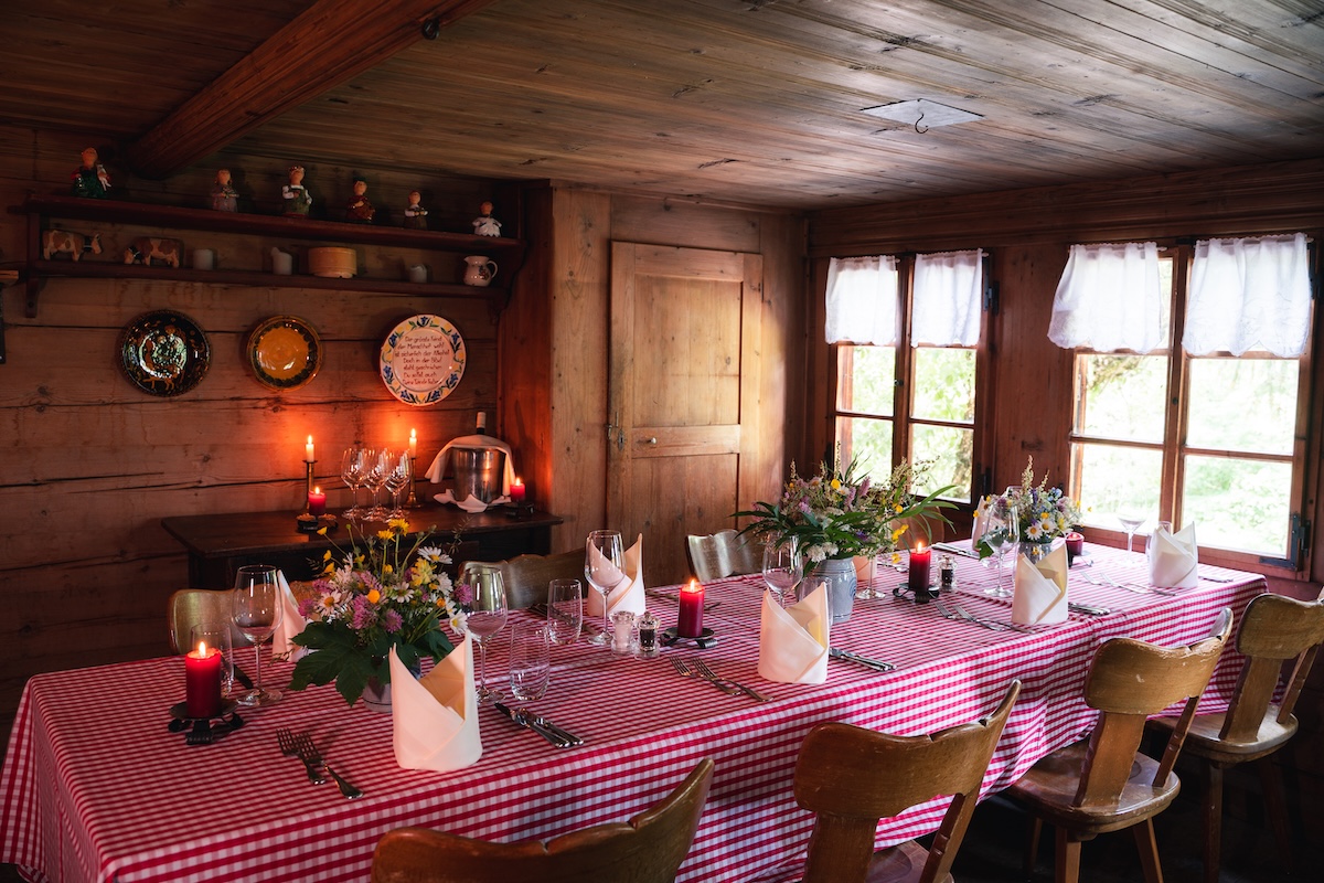 Seit über 250 Jahren thront die Flüemadhütte rund 1'300 Meter oberhalb von Gstaad. Das original erhaltene Ambiente und der Panoramablick auf die Gipfel des Berner Oberlands machen sie zu einer Traumlocation. Ob stimmungsvolle Kerzen oder frische Alpblumen – die Hütte lässt sich perfekt in Szene setzen. Platz bieten Stall, Stube oder bei schönem Wetter die grosszügige Terrasse für Feiern mit 15 bis 60 Gästen. Mehr dazu